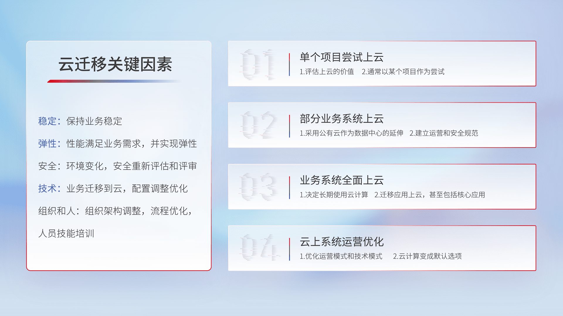 结合实际业务,,从规划设计、、、、云平台选型、、云原生改造、、、数据迁移、、集成交付,,,迁移全过程为客户识别最佳上云路径,,,,做好风险识别管理,,设计网络架构、、、身份权限、、安全审计合规、、、、操作审计、、、日志审计、、、监控告警策略、、多站点容灾设计等,,,,对云上基础设施进行整体规划,,,,提升IT治理水平,,,,以满足弹性、、、、高可用、、高性能的需求。。。。
