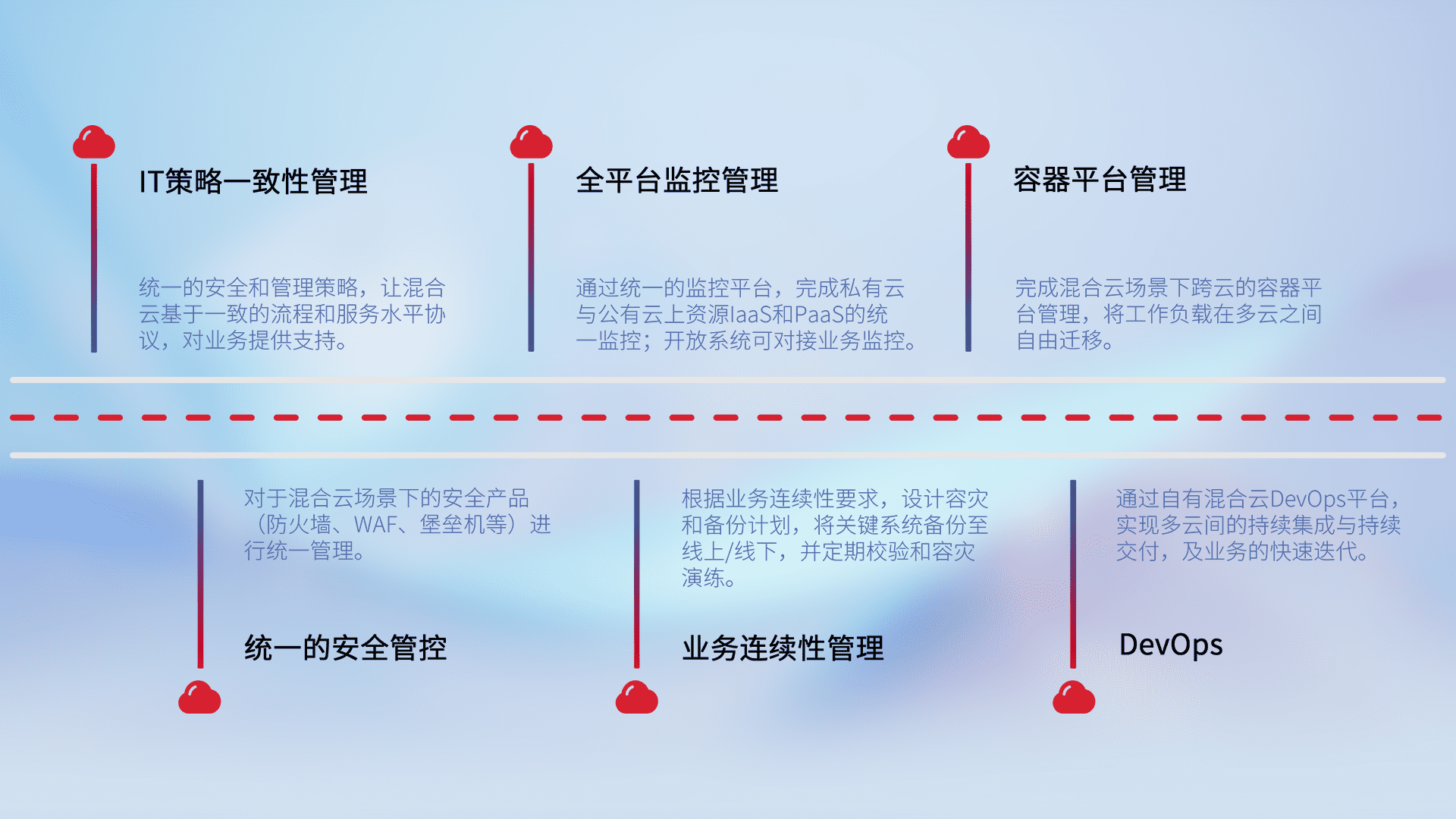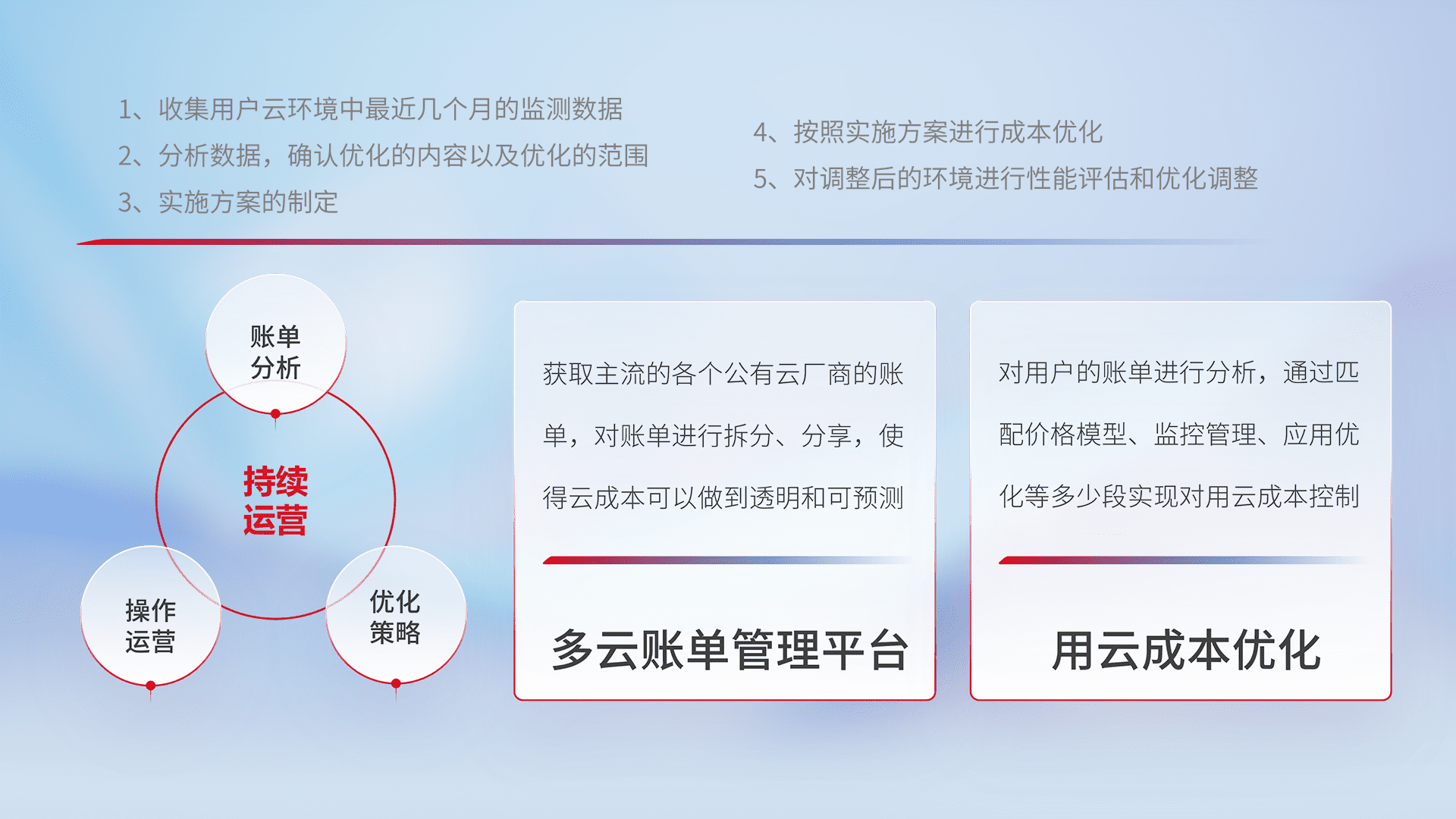 通过多云纳管,,,以统一的资源数据模型把客户的云资源进行抽象和封装,,进而实现对多云资源的统一操作,,,保障云资源管理的可靠性、、、、稳定性与可用性。。量身定制化运维内容,,,,配置、、、、开发运维、、补丁管理、、、、备份、、、监控、、认证和访问管理、、、、审计和日常巡检等,,,,保障在用云过程中的可靠度,,稳定度以及高可用率。。。。